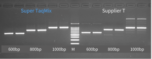 图1, 扩增不同大小的DNA片段。Supplier T: 厂家T同类产品;M: GDSBio #M1061, 100bp Ladder