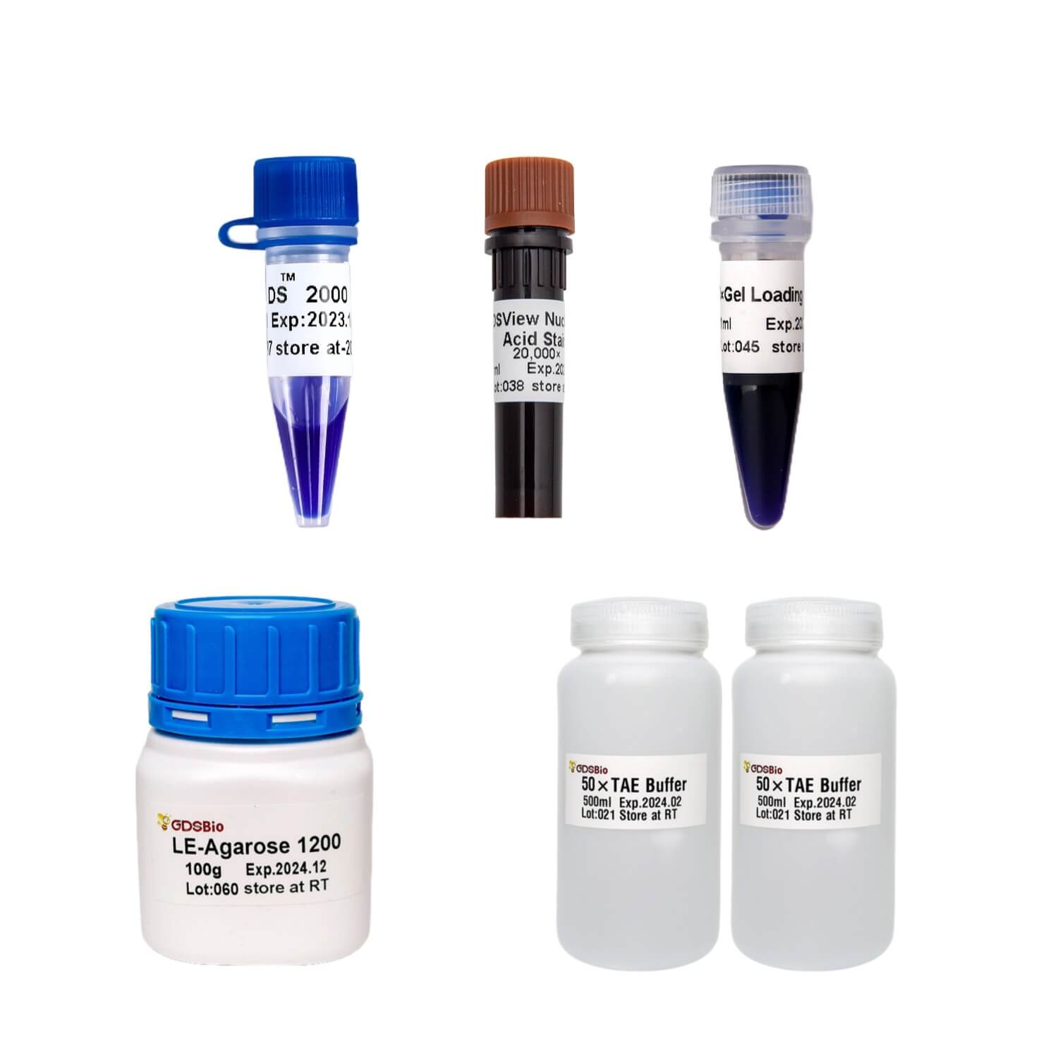 琼脂糖、50X TAE缓冲液于室温保存。DS2000、6X DNA上样缓冲液于室温或4℃保存,可于-20℃长期保存。DSView核酸凝胶染料 (20,000X) 于4℃避光保存。