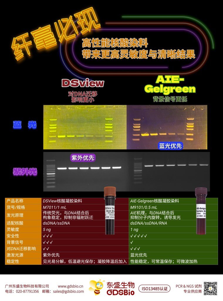 1. 灵敏度高:适用于各种大小片段的核酸电泳染色,灵敏度可达 1 ng;