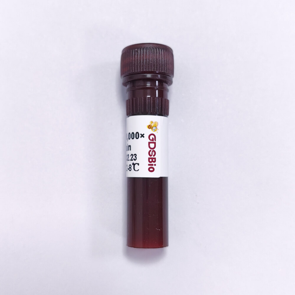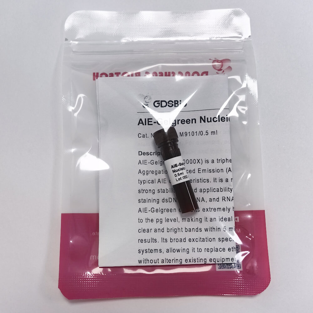 AIE-Gelgreen (10000X) 是一种基于聚集诱导发光(Aggregation-Induced Emission,AIE)荧光材料的三苯胺衍生物,具有典型的 AIE 特性。它是一种灵敏度高、稳定性强、适用性广且兼容性极佳的核酸凝胶染料,可用于琼脂糖凝胶和聚丙烯酰胺凝胶中的 dsDNA、ssDNA 以及 RNA 的染色。AIE-Gelgreen 表现出极高的灵敏度,检测限低至1 ng,是银染的理想替代品,能在 5 分钟内获得清晰明亮的条带,操作简单,结果直观。其具有较宽的激发光谱特性,可兼容多种成像系统,无需改变现有设备即可替换溴化乙锭(EB)和其他凝胶染料,适用于原先使用 SYBR Green 或 SYBR Gold 等核酸染料的凝胶成像和检测系统。此外,AIE-Gelgreen 可使用对人体无害的蓝光灯或蓝光成像仪进行核酸检测,避免了常规紫外检测对核酸样品的致突变性以及对人眼和皮肤的伤害,是与激光扫描仪配合使用的理想选择。