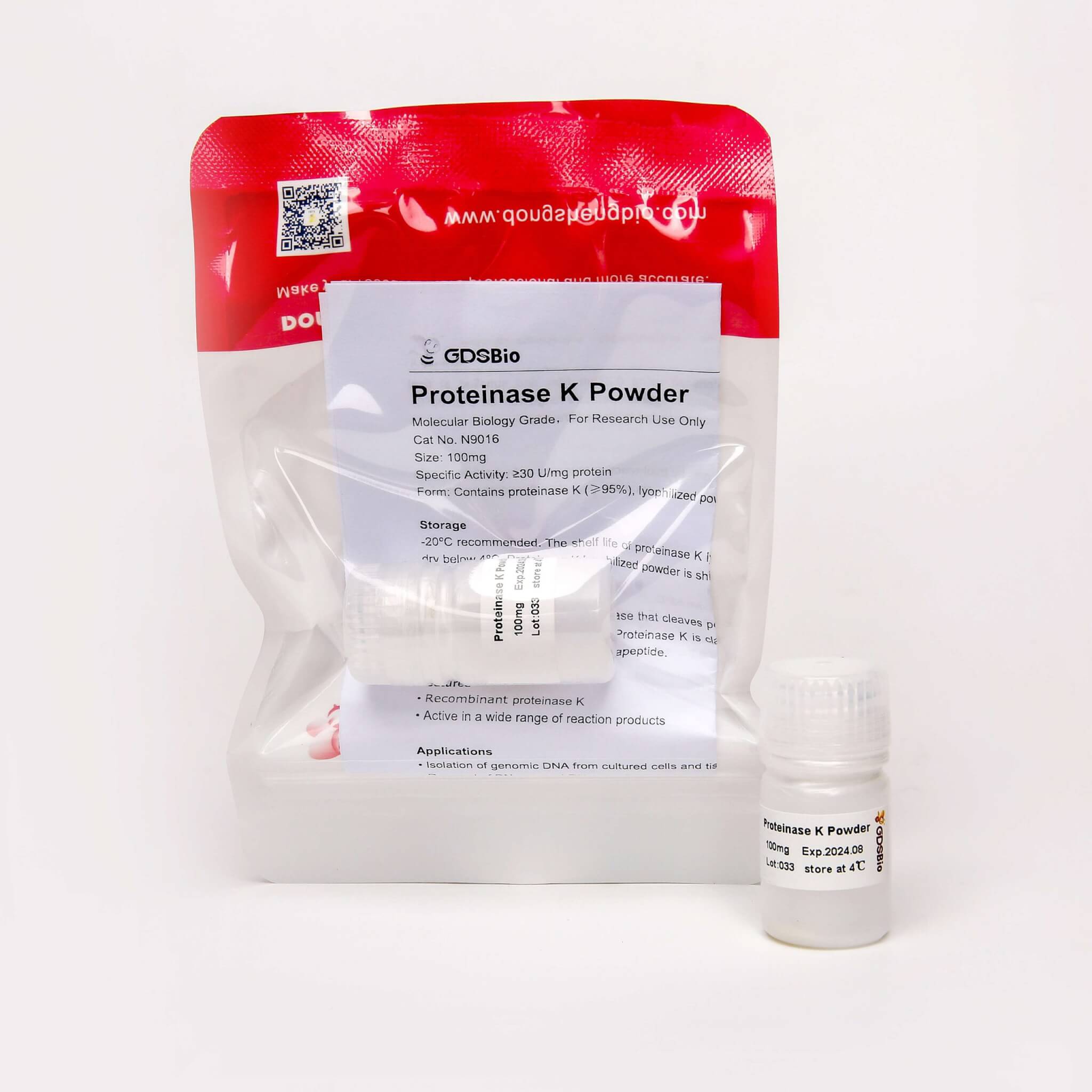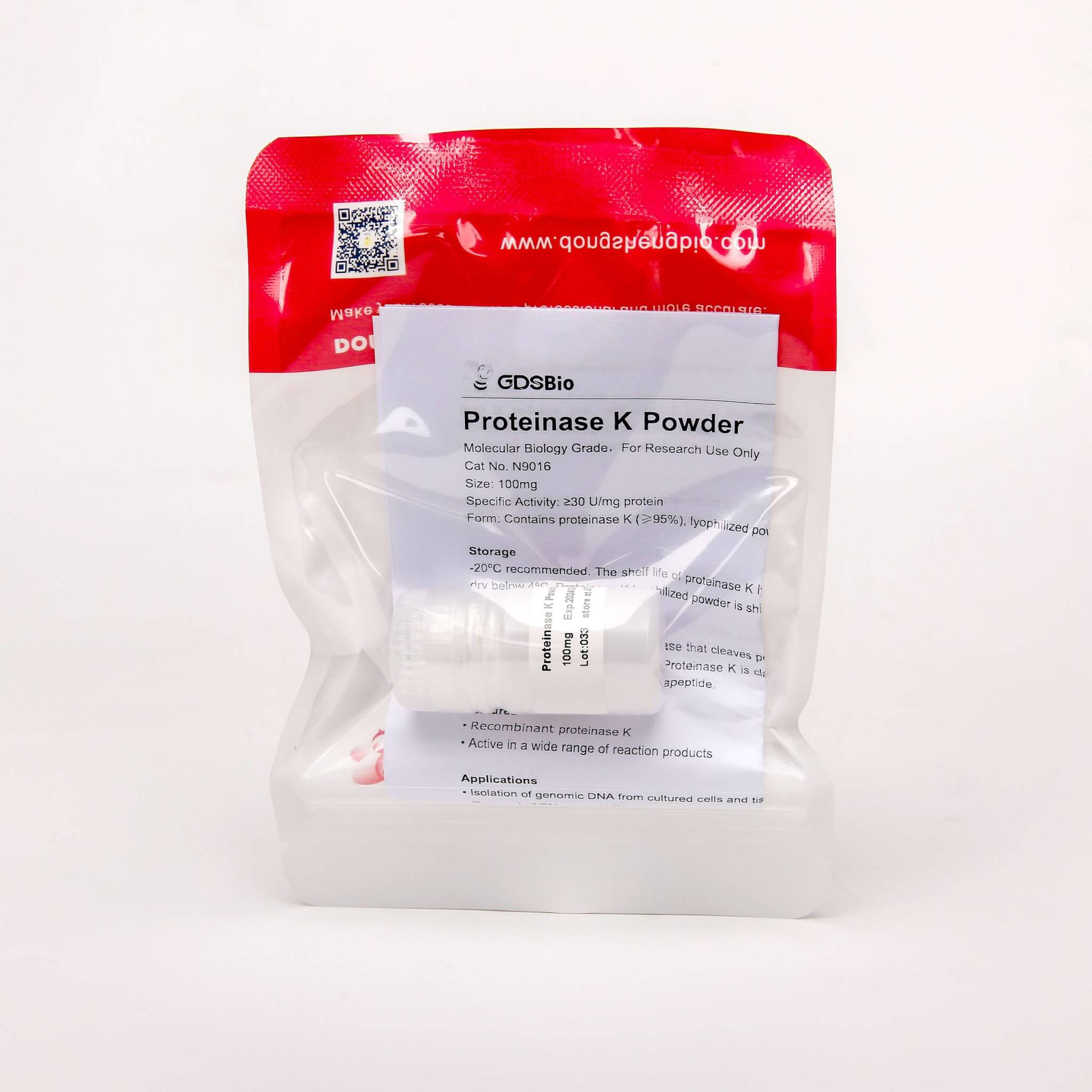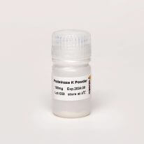 蛋白酶 K 是一种非特异性的蛋白内切酶,可以切割脂肪族氨基酸、疏水性氨基酸和芳香族氨基酸羧基端连接的酯键和肽键。分子量 大小为 29.3 kDa(单体)。该酶属于丝氨酸类蛋白酶,其水解的最小多肽是四肽分子。 蛋白酶 K 的推荐工作浓度为 0.05-1 mg/ml。0.2%SDS 或 1-4 M 尿素可刺激该酶的活性。 Ca2+可以保护蛋白酶 K 不会自我降解、增加蛋白酶 K 的热稳定性、调节蛋白酶 K 的底物结合位点。 蛋白酶 K 在宽 pH 值(4.0-12.5)范围内保持稳定,最佳 pH 值范围是 7.5-8.0。