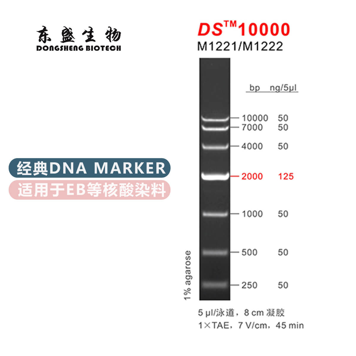 DS™10000是由7条双链线状DNA片段混合而成的DNA分子量标准(DNA Marker/ DNA Ladder),适用于确定250 bp至10 kb的线性双链DNA片段大小,指示带为2000 bp,便于电泳后观察。每条带都通过严格的物理定量,可用于测定目的片段的大小和含量。