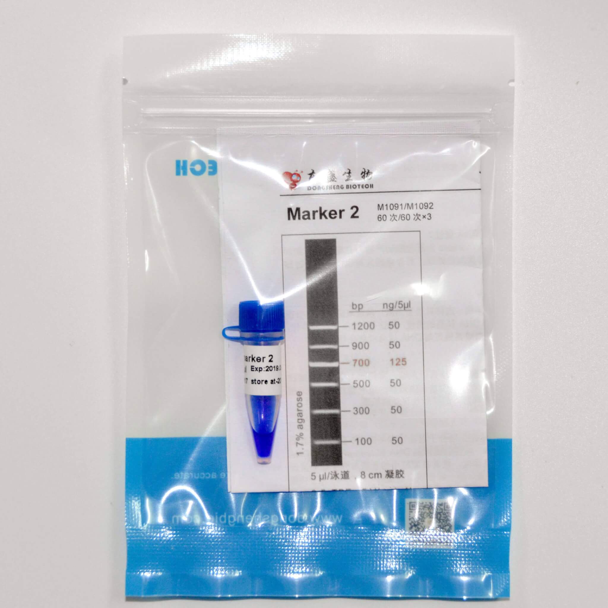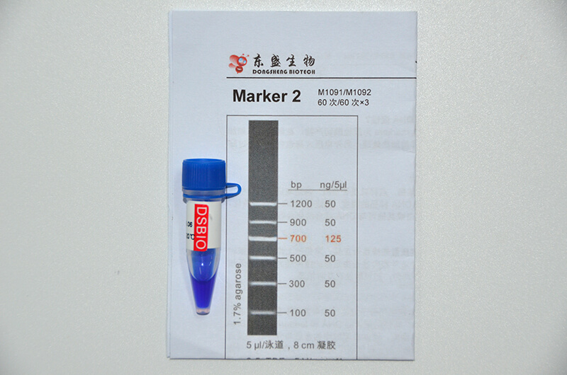 Marker 2是由6条双链线状DNA片段混合而成的DNA分子量标准(DNA Marker/ DNA Ladder),适用于确定100 bp至1.2 kb的线性双链DNA片段大小,指示带为700 bp,便于电泳后观察。每条带都通过严格的物理定量,可用于测定目的片段的大小和含量。