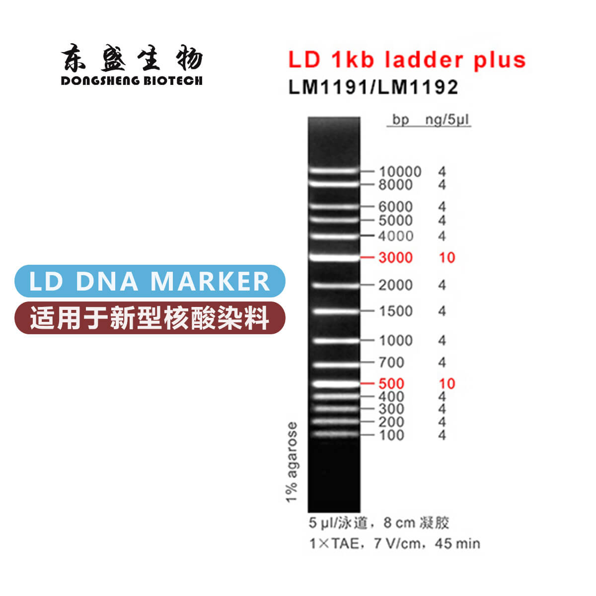 LD 1kb Ladder Plus是由15 条双链线状DNA片段混合而成的DNA分子量标准(DNA Marker/ DNA Ladder),适用于确定100 bp至10 kb的线性双链DNA片段大小,指示带为500 bp3000 bp,便于电泳后观察。每条带都通过严格的物理定量可用于测定目的片段的大小和含量本品为xpj.com官网生物LD系列DNA Marker,适用于新型核酸染料(如xpj.com官网DSRed等)预染法琼脂糖凝胶电泳。
