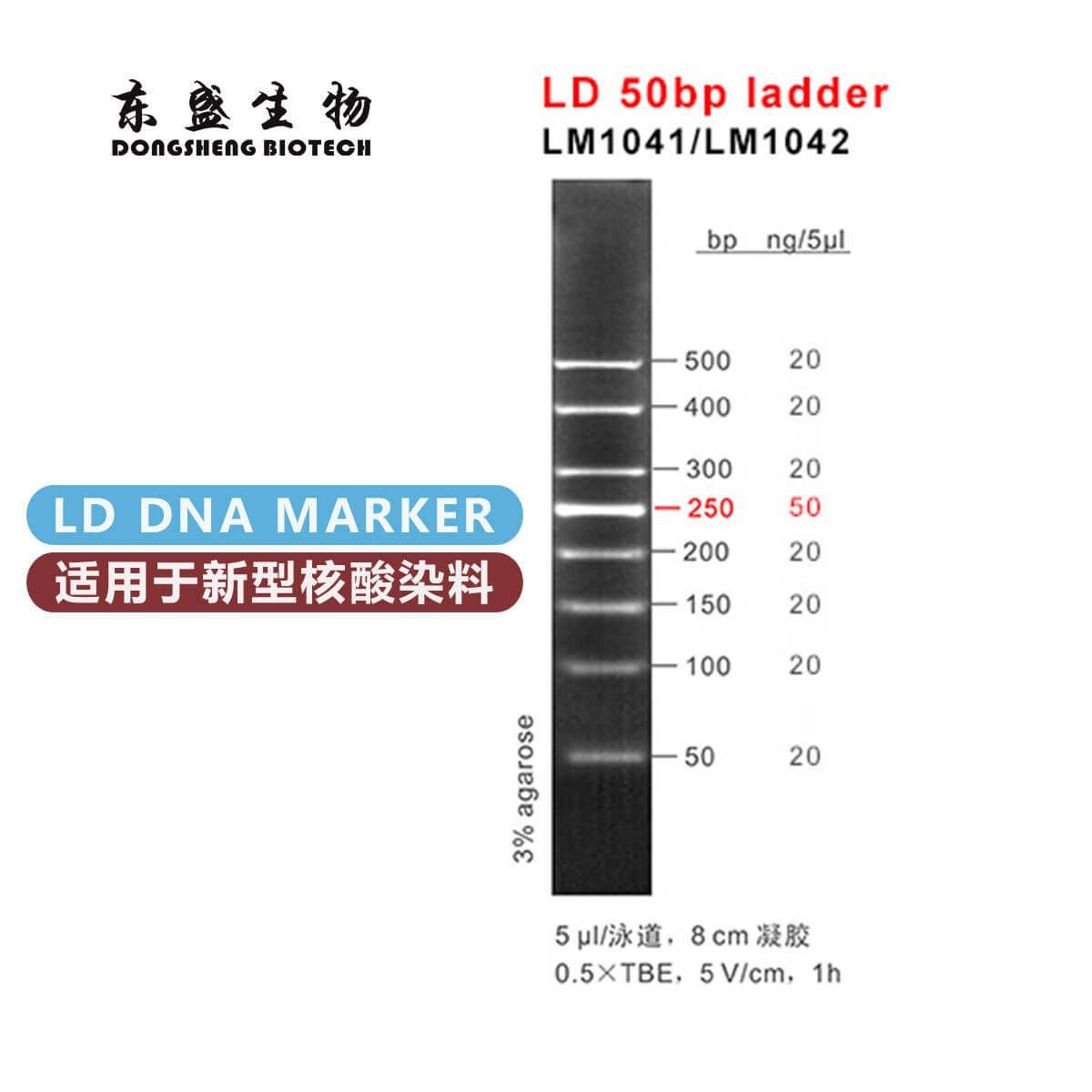 LD 50bp Ladder是由8条双链线状DNA片段混合而成的DNA分子量标准(DNA Marker/ DNA Ladder),适用于确定50 bp至500 bp的线性双链DNA片段大小,指示带为250 bp,便于电泳后观察。每条带都通过严格的物理定量可用于测定目的片段的大小和含量本品为xpj.com官网生物LD系列DNA Marker,适用于新型核酸染料(如xpj.com官网DSRed等)预染法琼脂糖凝胶电泳。