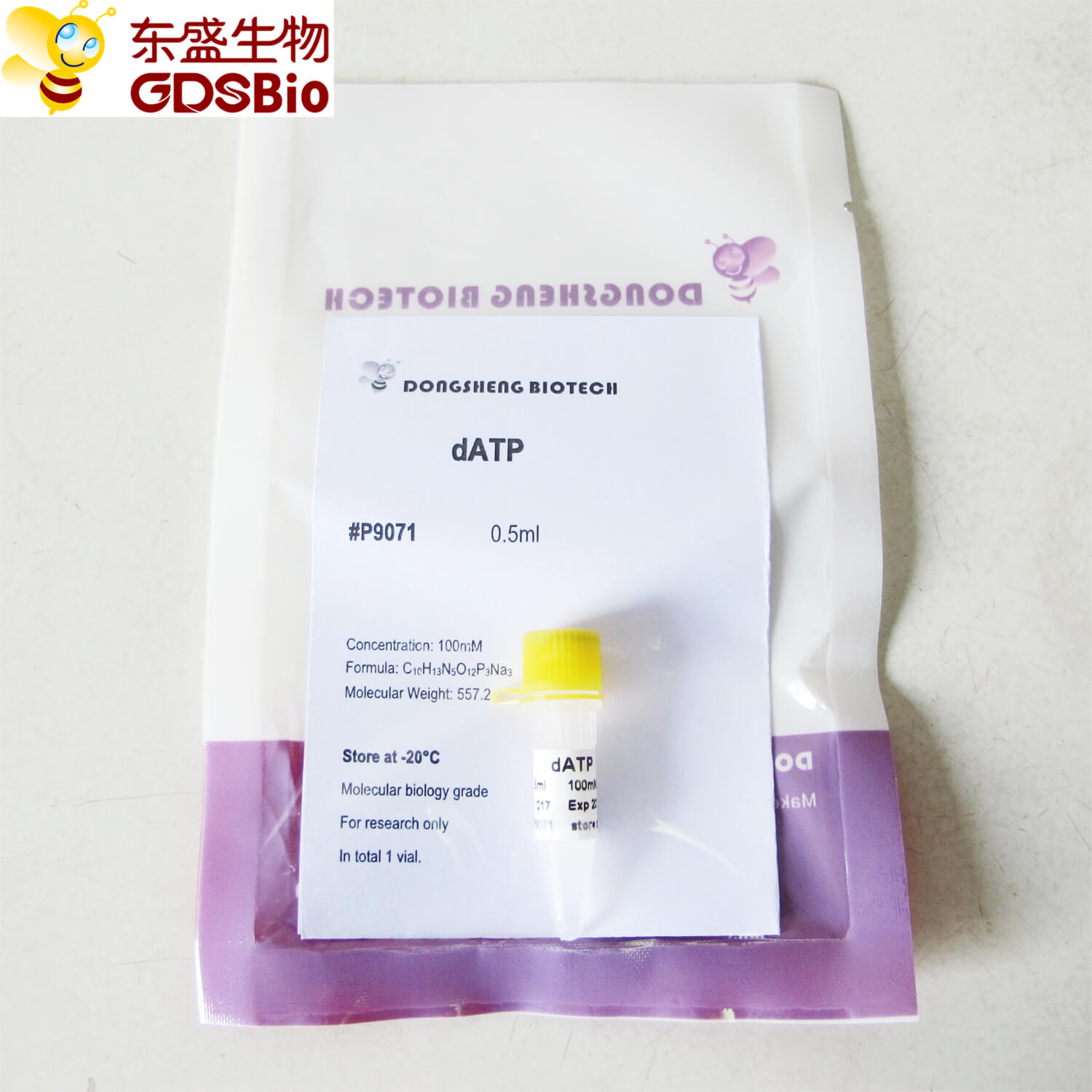 dATP 即 2’-deoxyadenosine 5’-triphosphate,中文名为三磷酸脱氧腺苷。本品以溶液钠盐形式提供,浓度 100 mM,pH7.0,可以 作为耐热 DNA 的底物使用。