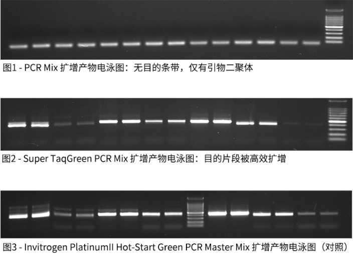 Super TaqGreen PCR Mix与Invitrogen PlatinumII Hot-Start Green PCR Master Mix有一致的功能,可使用通用退火温度,可减少反应优化步骤,并实现对不同PCR反应同时进行扩增。将创新型缓冲液、高性能 Taq DNA聚合酶,以及出色热启动技术独创性地结合在一起,即使在最严苛的实验应用中,也可获得出色的PCR结果。