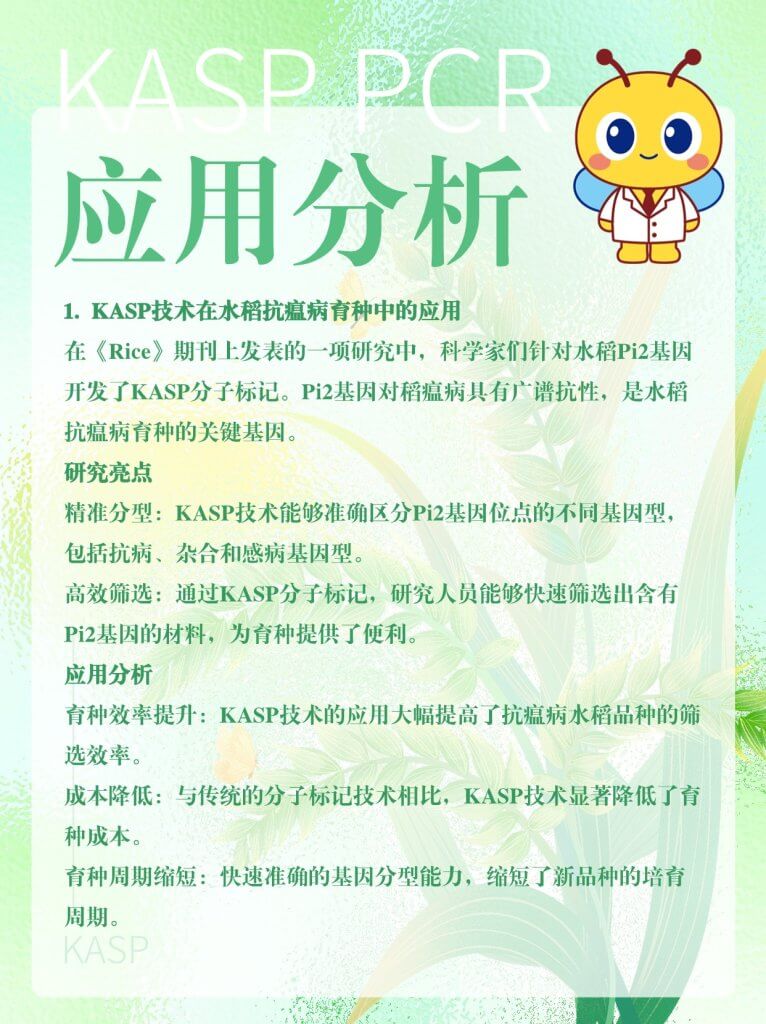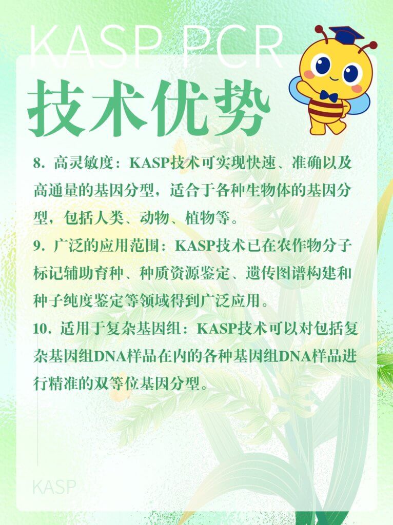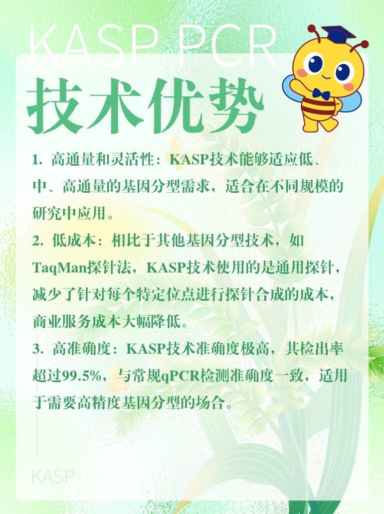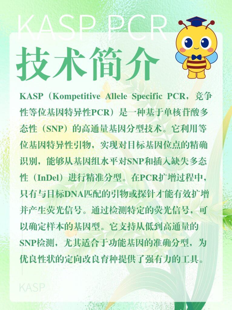 KASP(Kompetitive Allele-Specific PCR,竞争性等位基因特异性 PCR)是一种用于基因分型的技术,基于等位基因特异性PCR。它使用一种独特的竞争性PCR机制,能够检测特定位点的单核苷酸多态性(SNP)和插入/缺失(InDels),具有通量高、成本低和可操作性强等优点,在农作物性状遗传和改良研究等领域具有广泛的应用。