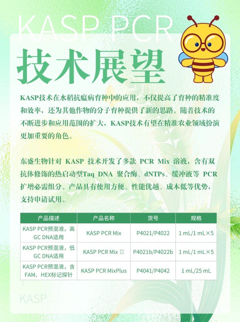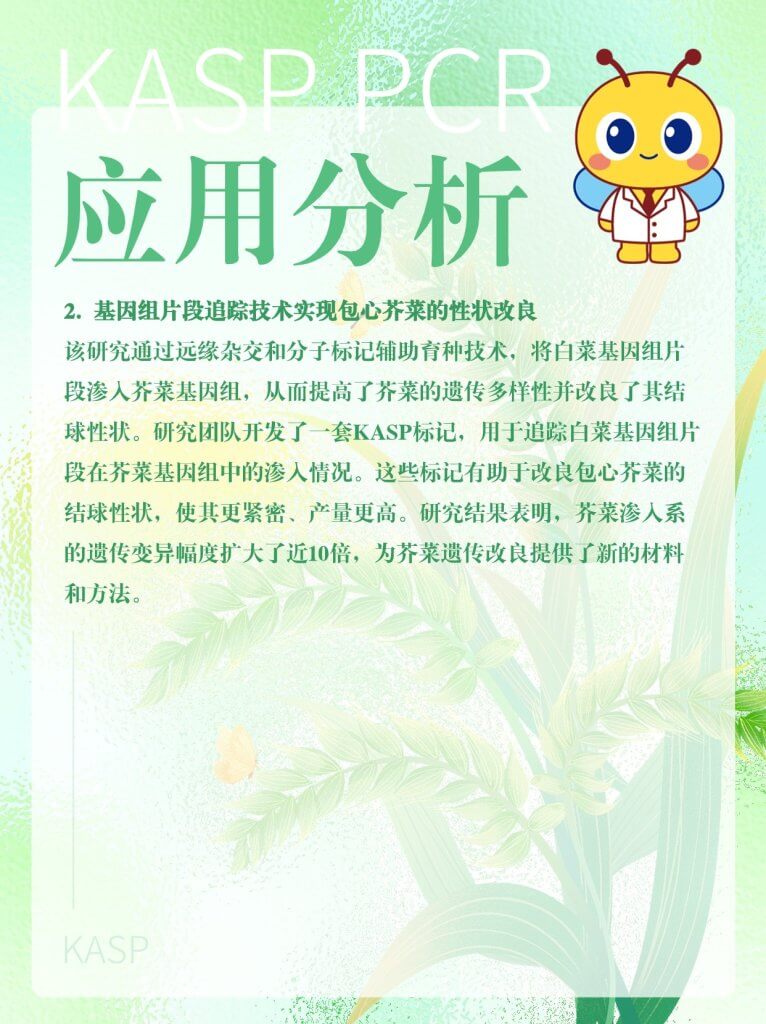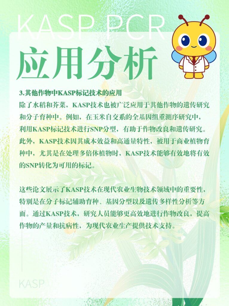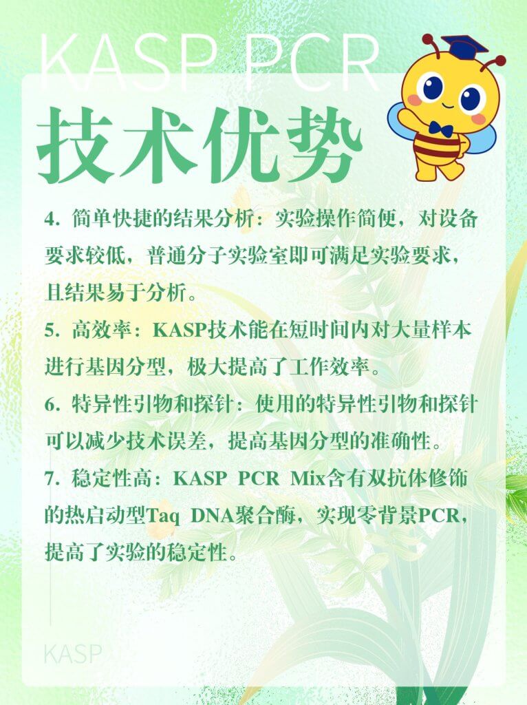 KASP(Kompetitive Allele-Specific PCR,竞争性等位基因特异性 PCR)是一种用于基因分型的技术,基于等位基因特异性PCR。它使用一种独特的竞争性PCR机制,能够检测特定位点的单核苷酸多态性(SNP)和插入/缺失(InDels),具有通量高、成本低和可操作性强等优点,在农作物性状遗传和改良研究等领域具有广泛的应用。